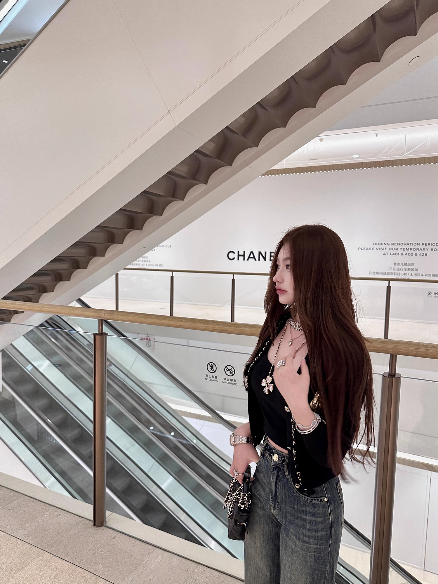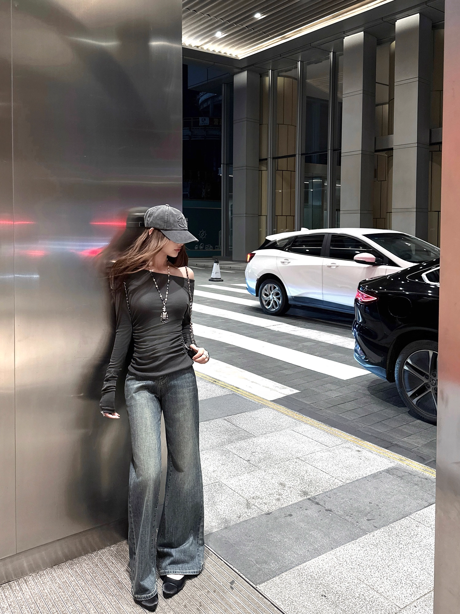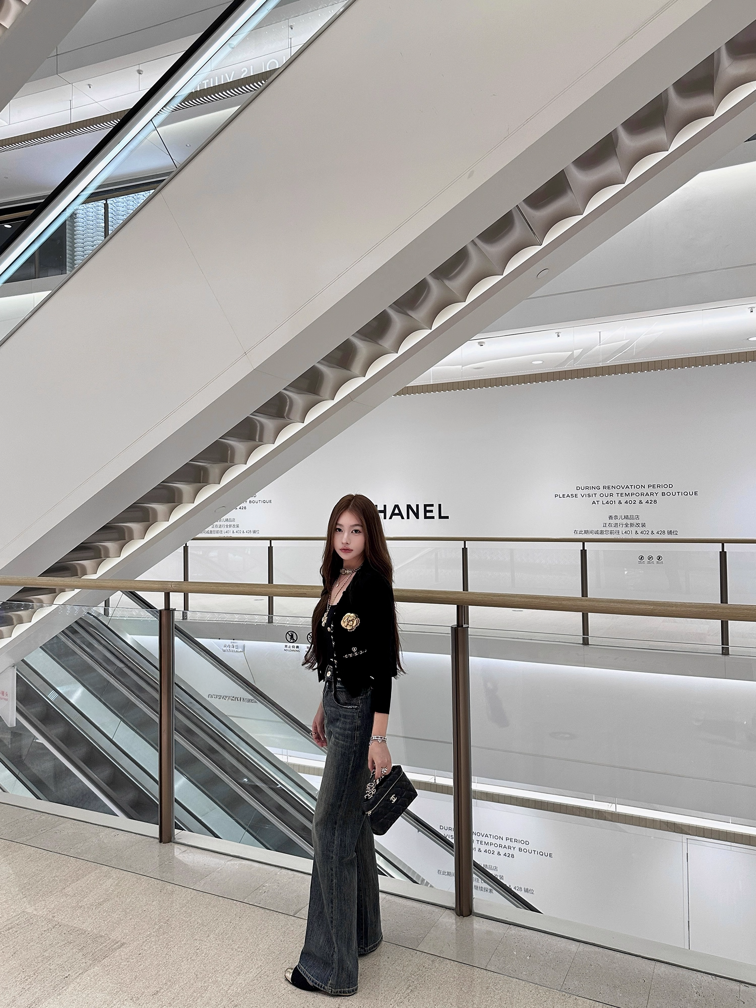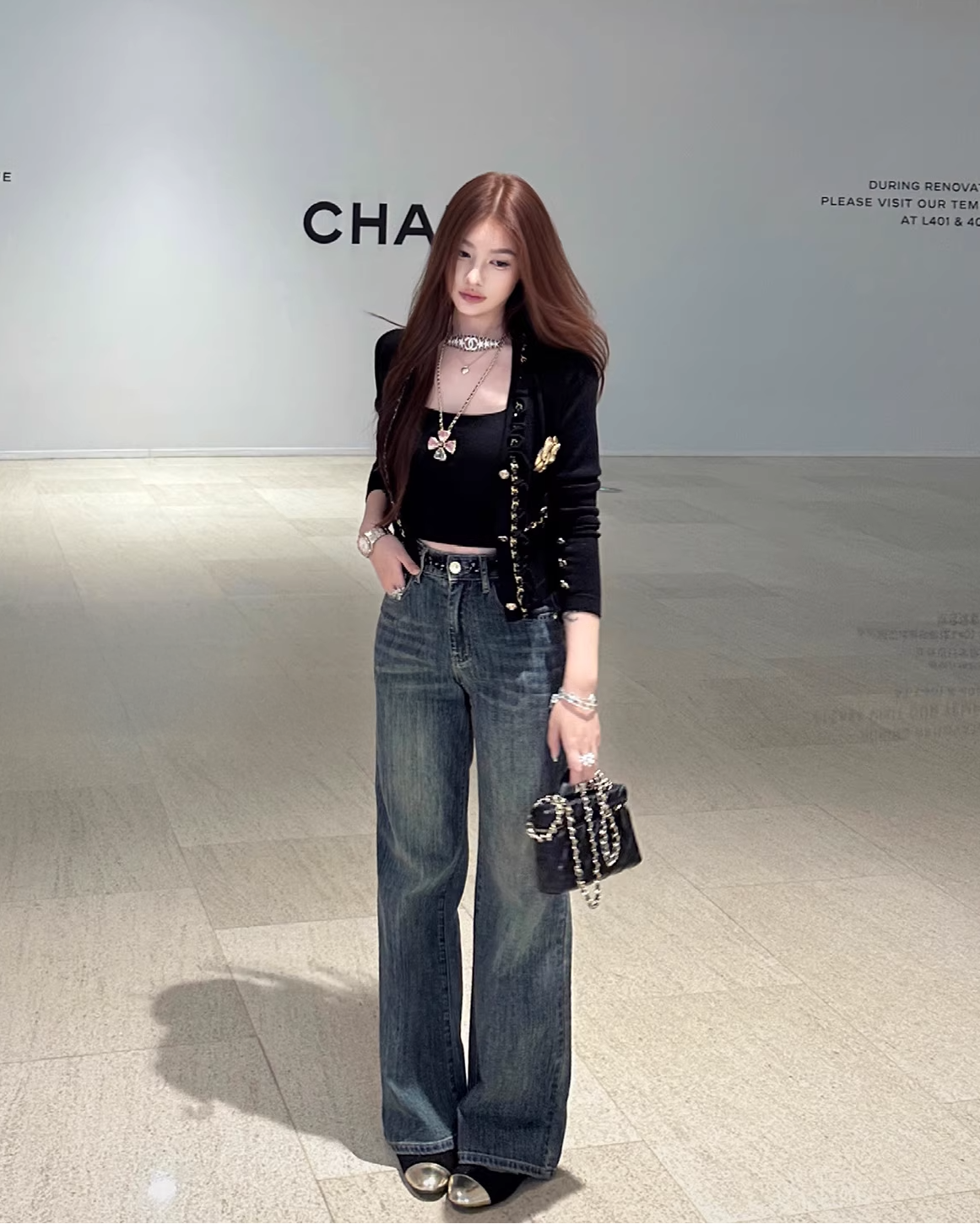 ウエストにキラッとしたベルトのようにコードが通ったデニム